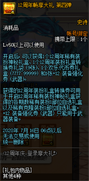 第四弹奖励是一件天空礼盒,这一个礼盒的意思应该是随机打开获得一件某一期的天空或者是克隆天空,然后可以用9张转换券我也看不到,因为说用于开启礼盒,但神秘礼盒就一个,券子却有九张,比较大的可能性还是洗成某一期的天空。除了天空还有一张+12的武器强化券,这一个比较可惜,对大号是固伤的职业来说武器强化用途不大,如果可以改成不限制武器,可以强化耳环就很赞了。而欢乐代币券应该是和以前一样,7777/8888/9999/99999的几个档次,如果可以开到8888直接弄一套NPC装扮礼包,可以用里面的完美装扮合成器合成出一件天空。