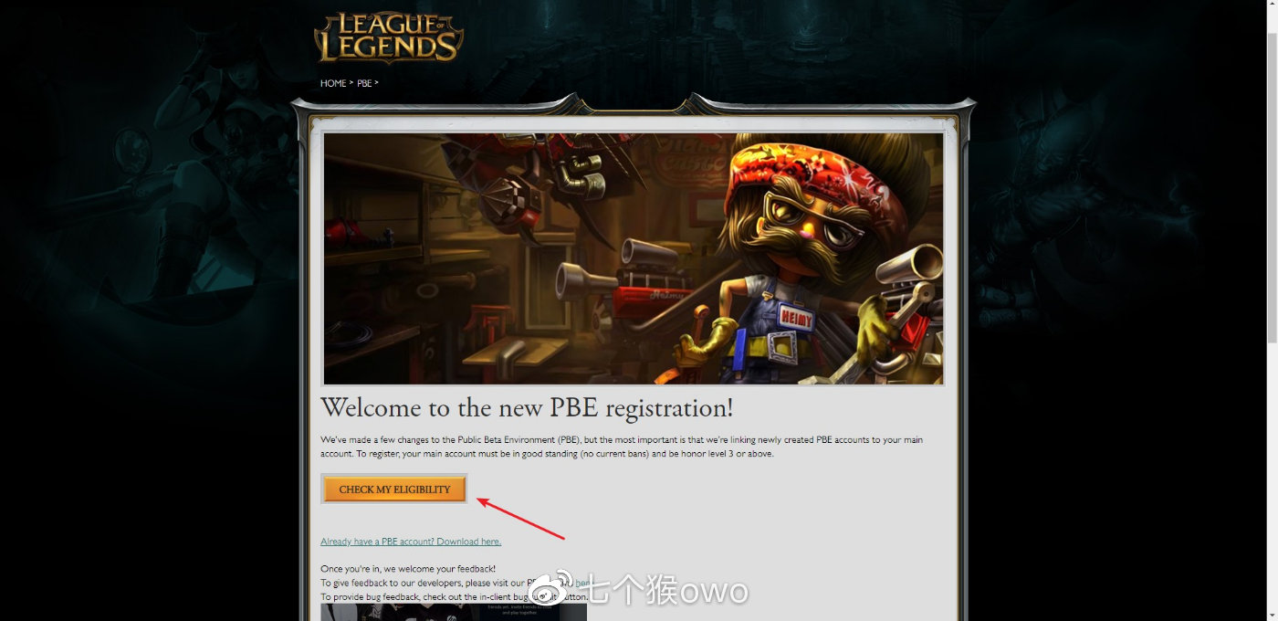 设置好之后,进入拳头PBE官方申请页面,点击【CHECK MY ELIGIBILITY】