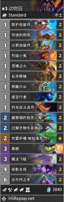 一个进攻卡组如果靠一般按费用进行的节奏无法有效制胜,就必须更加极端地去追求高上限的构筑组合。如今主流的动物园不仅放弃了偏向稳定站场的自伤体系,也放弃了弥补下限的海蛇蛋+怪盗天才,完全把价值围绕在了拾荒小鬼和古尔丹之手这两个最高价值的核心牌上。除了这两个体系,已经几乎只携带魔法飞毯和最容易出手、登场受益最高的1费随从,甚至带上了石牙野猪来提高斩杀。
