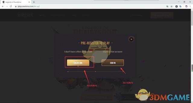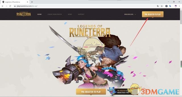 第一步:打开符文传说LOR外服官网:https://playruneterra.com/,点击右上角黄色按钮