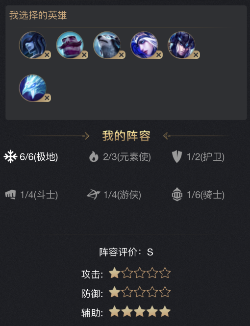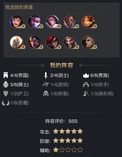6贵族分别是盖伦、薇恩、剑姬、卢锡安、女坦、天使,其中的盖伦、薇恩、剑姬都是一星英雄,前两个回合很容易就能凑齐,除了剑姬,其余都可以升到三级。由于需要天使这个五星英雄,才能有贵族BUFF,因此中期我们可以用三剑士过渡。后期6贵族凑满,全体100护甲的加成再加上35的回血,你的对手将毫无游戏体验。