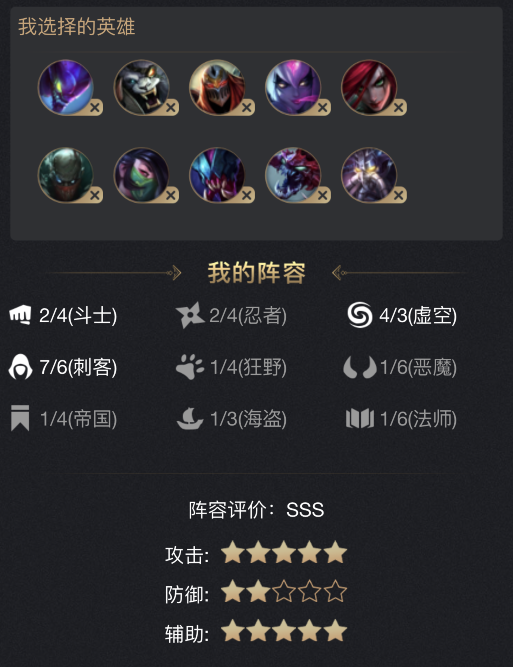 虚空、刺客被排在最后的原因是太太太太太脆了,无论是刺客还是虚空,除了大虫子,其余一碰就倒,怕控怕AOE。攻击能力虽然很爆炸,但这同时也加快了敌人的施法速度,死得更快了。但他却能完美的克制所有玩家向往的T1级阵容,6贵族阵容和德莱联盟的强大在于全体友军加100点的护甲和德莱文在后排的爆炸输出,而虚空羁绊无视护甲,6个刺客直接往德莱文脸上跳,直接被安排。这也说明了,没有最强的阵容,只有最会玩的召唤师。