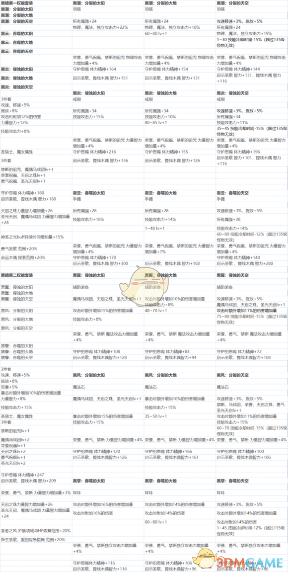 太阳套兼顾了盛宴 镜子 双觉 和个别补刀技能的伤害 暗帝作为典型的双觉加素质三连的职业说实话选太阳和天空单件属性都不是很好 建议选大地。
