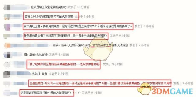 很多网友对于这次的11周年庆在线奖励非常不满,毕竟一年只有一次的大活动每年都来差不多的奖励,并且一点吸引力都没有,这让玩家们怎么坚持守护阿拉德大陆啊!就像赛利亚每天都会说的一句话,又是充满希望的一天,然而策划就没有让玩家们看到过希望。