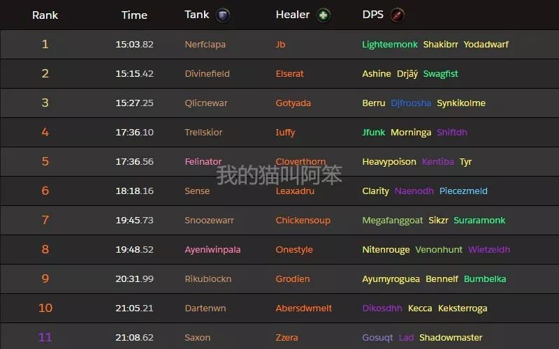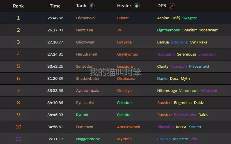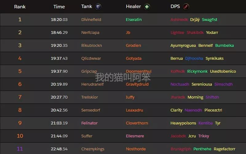 raider.io的比赛页面提供了每个副本前20名的车队排名,下面一起简单看一下高端车队们在比赛排行榜上的名次,以及这些大秘境高玩所选择的职业和专精。