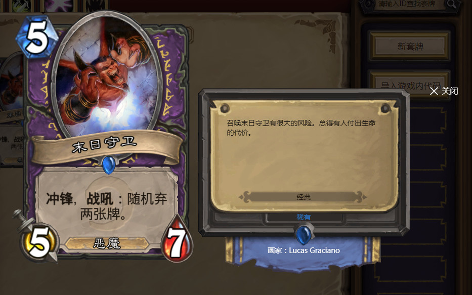 末日守卫这张卡牌的副作用看似非常大,因为其战吼效果,所以你必须舍弃掉手中的两张卡牌。但是聪明的玩家们总是能找到方法规避这一副作用,比如大家所熟知的快攻玩法,又亦或是另外一种变种的模块术。利用模块吃掉末日守卫,再让场上召出更多的同类,你消灭他了?没关系,还有一手术士的DK。无论如何,末日守卫一直都在术士的套牌中扮演了非常重要的角色。所以,他的离开,也许会让许多玩家拍手称快。