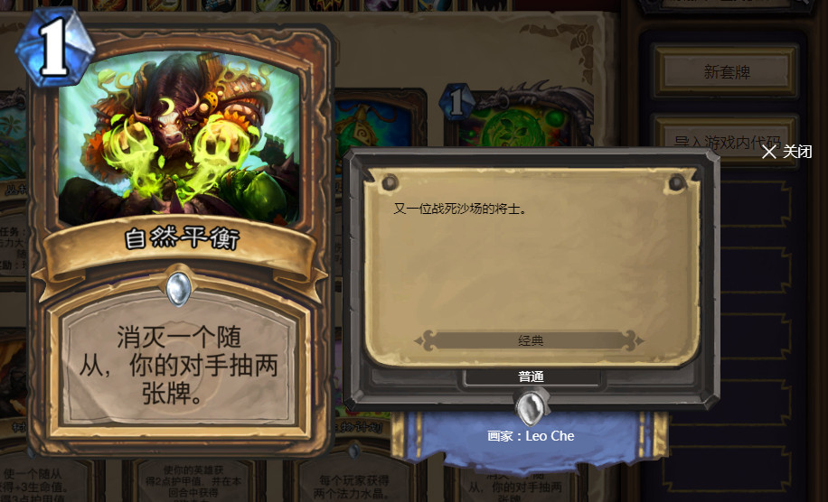 自然平衡这张卡牌一直都受到了非常多的争议,因为费用太低,只有1费,但是效果却非常显著。尤其在对抗一些相对慢速的卡组时,如果对方的手牌足够多,你的1费平衡,很可能让对方的一些关键卡牌爆掉,而更加尴尬的是,假如对方的牌库中的存牌不多时,你更是可以让对方直接提前进入疲劳,因为这种特点而诞生出的玩法,自然要提其中的机克德这种玩法了。