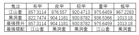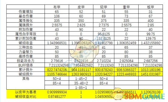 图5:有了图4就可以计算总BUFF倍率(实际上只有皮甲与其他4个甲不同,更高一点),再结合图2图3得出来的5甲提升数据。