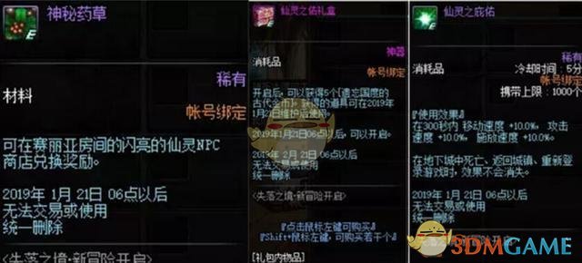 这个活动阿福君猜测是与春节套有关的,因为获得的仙灵之佑礼盒需要在2019年1月21日更新之后才能使用,此时正是春节套上线的时候,遗忘国度就是春节地下城没得跑了。