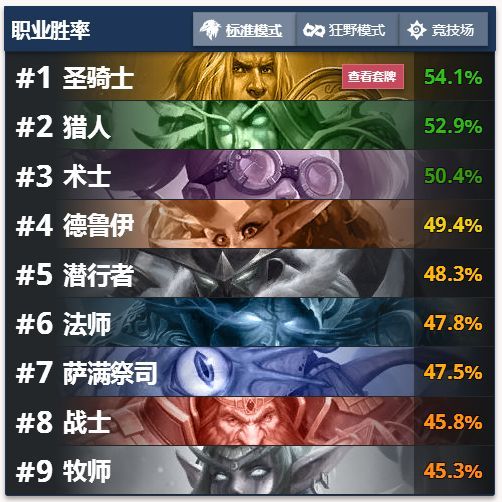 实际上的情况其实要乐观很多:每个职业其实都展现出了多样性的构筑模式,最显著的应当属德鲁伊和猎人,这两个职业都有超过十种不同的构筑形式,且有五个以上的高胜率卡组;所有职业都有至少五种不同的构筑形式,目前除了战士的整体热度较低之外,其他职业都拥有了不少玩家支持,当然这其中萨满、战士、牧师的整体胜率堪忧。主要是因为在对局中尚有大量的快攻萨、各类型战士和牧师在错综复杂的天梯环境中普遍存在天敌和均势对局。