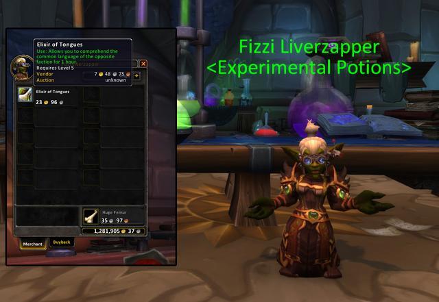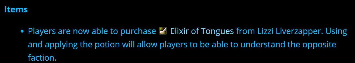 玩家现在可以在菲兹·电胆处购买语言药剂。喝下这个药剂能够让玩家听懂敌对阵营玩家说的话。 p