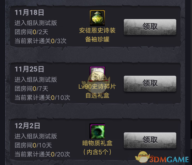 所以某位勇士想领取11月18日的礼包,他需要在16日、17日和18日任意两天登录助手打团房间并且在17号之前通关3次团本,这样18号就可以安心领奖了,以此类推!