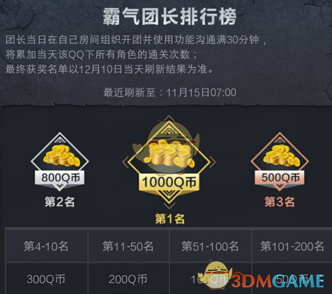 如果你想获得更多的QB,那么来参与霸气团长排行榜是你不二的选择,每天记得都要登陆自己的助手团队频道并且尽可能在活动期间通关游戏团本副本,最终排名按照使用助手组队测试版功能的当天的游戏通关次数累加进行排行,最终结果将在12月10日刷新,将根据排名发放q币,最高可得1000q币!