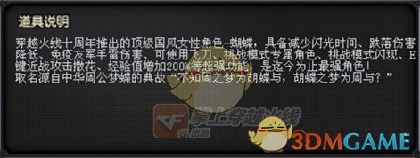 穿越火线十周年推出的顶级国风女性角色-蝴蝶,具备减少闪光时间、跌落伤害降低、免疫友军手雷伤害、可使用飞刀、挑战模式专属角色、挑战模式闪现、E键近战攻击撒花、经验值增加200%等超强功能,是迄今为止最强角色!