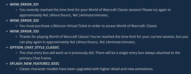 通过对怀旧服试玩版的一些字符串的分析,可以看到试玩版的时间限制的报错信息,还提到了怀旧服的角色模型进行了升级,添加了更多的细节和全新的动画。