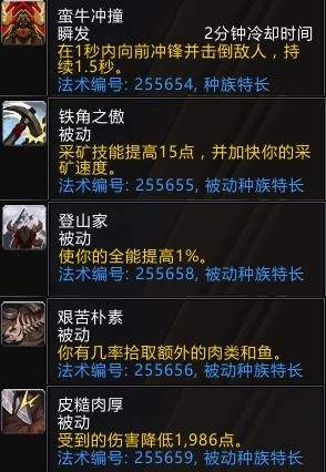 毫无疑问,喜欢采矿、采集的玩家首选至高岭牛头人,毕竟可以使采矿速度提升,而且还有几率拾取更多的肉和鱼。蛮牛冲撞这个天赋显然更适合近战职业,法系职业一般不喜欢冲上前去击倒敌人1.5秒吧!而像提高全能、受到伤害降低对各职业受益也是差不多的,所以说近战职业首选,其余次之。