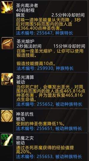 光铸德莱尼显然更照顾喜欢锻造的玩家,不仅能使锻造技能提高,而且还可以直接召唤熔炉。圣光裁决者这种主动AOE伤害显然更照顾近战职业,但远程职业一样有受益;降低神圣伤害并不取决于玩家的职业选择;而像圣光清算、恶魔之灾这两个天赋就会略显鸡肋。总体说来,此种族选择任何职业几乎都是没有啥差别的。