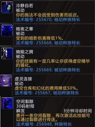 虚空精灵的冷静自若天赋可以让你的施法不会因受到伤害而推迟,很明显读条职业更为吃香,法师、牧师、术士、奶僧都能获得其受益,猎人、盗贼、战士是肯定没有用处的。除此之外,其余几个天赋对任何职业都有着基本相同的受益,尤其可以省掉幻化的费用,以及具备位移的能力。总体说来,法系职业优先,物理职业次之。