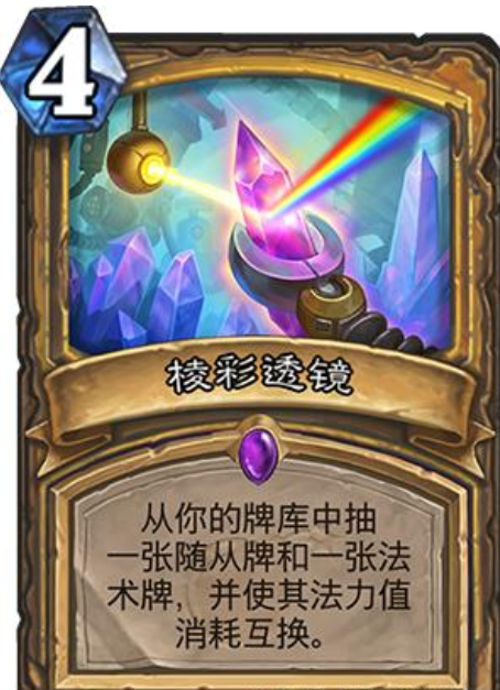 不过,这种套路通常缺少过牌,我个人会建议玩家带上至少1张【棱彩透镜】,它效果是“从你的牌库中抽一张随从牌和一张法术牌,并使其法力值消耗互换”,有时候让巨化术以低于5费的形态出现,或者2点水晶就能出大城管能赚得不少节奏!另外,这套偶数骑的解场能力并不强,大概也只有炎术师+生而平等一种解法,而用大城管软解需要铺场面,所以有时效果低于预期。