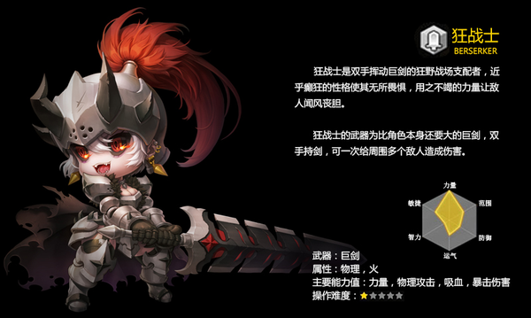 狂战士是一个近战输出职业,使用一把等身的双手重剑进行战斗,强力的旋风斩可以轻松造成可观的AOE伤害,还能够将HP转化为SP进行持续输出,需求属性为力量,物理攻击力,HP,暴击。官方给出的操作难度为1颗星,是一个前期版本比较强势新手职业。