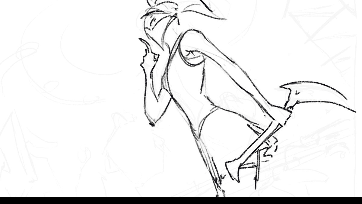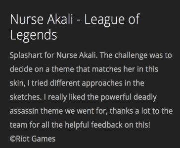 这就是实习护士阿卡丽的皮肤原画。我在草稿中尝试了不同的方法,能确定一个与她相匹配的皮肤主题是个挑战。我超喜欢我们所追求的强大的无情刺客的主题,非常感谢我的团队为皮肤提供有帮助的反馈。