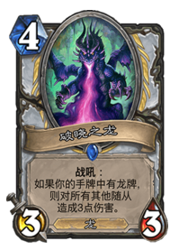 偶尔喷自己回血,一般用于进攻,喷对手,只要对手一回合奶不起来,我们就可以利用2-4个震爆,直接斩杀对手结束游戏,类似当年壕战的洗剪吹。而这张卡在这套牌中还是龙种,可以触发破晓龙的效果。卡组关联性很强。