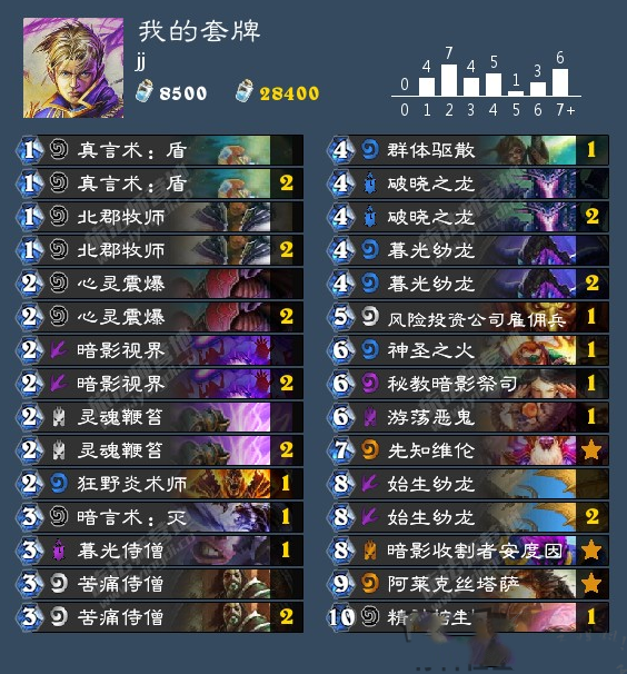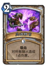 一张低费aoe,虽然打快攻不一定能清掉快攻多少场面,但是却非带不可,因为他的回血能力对牧师而言太重要了,可以帮助牧师手黑的时候依然可以战胜快攻,通常情况下我们都是把一切压在破晓之龙上,但要是没及时抽到呢?血量就非常伤,后期即便场面挽回了,也很容易被冲锋一波带,冤死。灵魂鞭笞配合上维纶不仅变成奉献的伤害,而且一口可以吸10+的血,一波让快攻绝望。