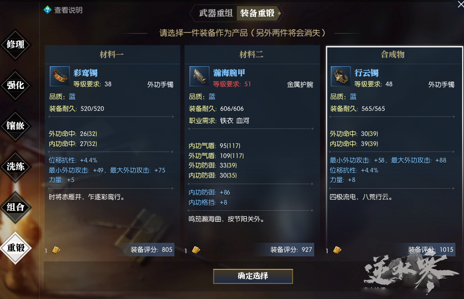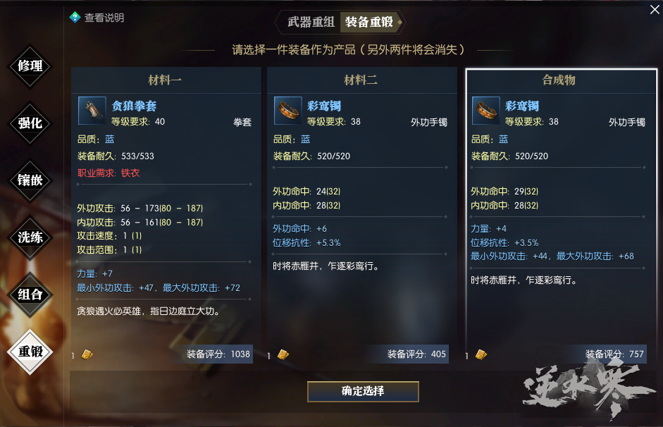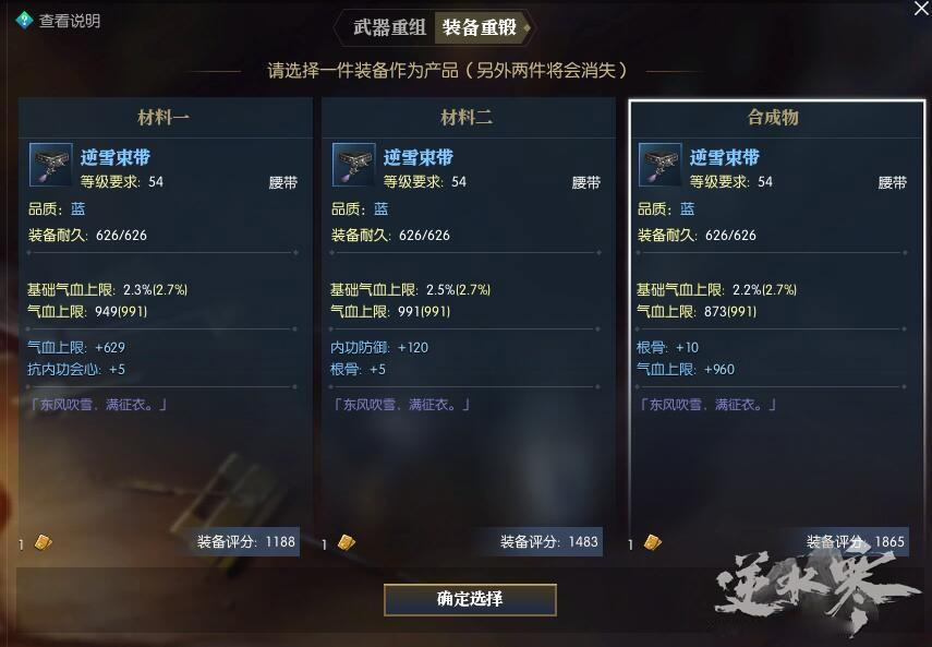 如果装备A的词条1是我们想要的,词条2是我们不想要的;我们又想要词条3,那就去找一件拥有词条3的同部位同等级同品阶装备(狗粮)来与装备A重段;就有机会合成一件既具备词条1又具备词条3的装备;