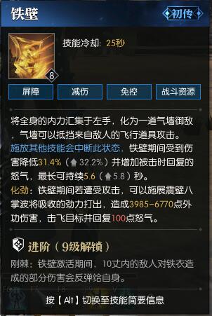 【铁壁】铁衣PVP神技,可以说有了这个技能,铁衣才算真正有了和其他门派一较高下的能力,可能很多师兄弟都没用把这个技能加入到PVP攻击序列里去,但我真心推荐大家可以去试一试。铁壁这个技能,集减伤,免控,远程伤害,控制,回怒于一体,当之无愧的铁衣PVP最核心神技,5.6S的免控和30减伤,被人攻击后可以主动释放一道气劲,攻击前方直线上的敌人,命中后地方会倒地。