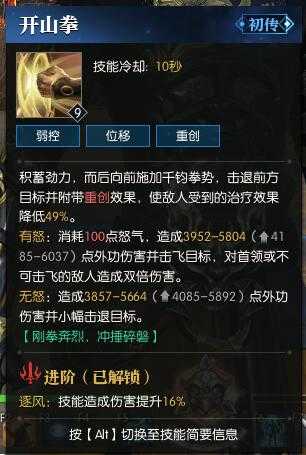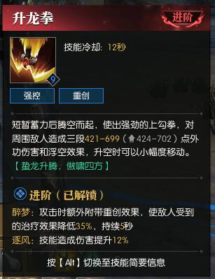 【升龙拳】很舒服的一个控制,在裂地斩没有9级进阶之前,我觉得这个技能的控制效果是最好的,能够很稳定的打全一套无影拳加瞬发追打,但是技能前摇太慢,感觉有0.3-0.5S的蓄力时间,释放命中率不如裂地斩。在9级进阶以后附带了减疗效果,这个技能的价值立马翻倍,成了打奶神技,让铁衣单挑有了面对素问的底气。