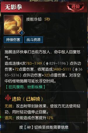 【无影拳】铁衣最常用也是最好用的主要伤害技能,9级进阶后还附带封脉效果,释放完毕后触发瞬发追打效果还能回复100点怒气,堪称神技,一旦被这技能黏住,不死也要掉层皮。所以一般会在控住敌人以后立马用一套无影拳,也就是开局力劈过去,裂地踩晕,然后无影拳加追打,不交解控的话对手至少要掉4分之一到3分之一。