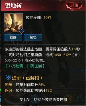 【裂地斩】:铁衣最稳定的一个控制,范围够大,附带回拉效果,9级进阶以后晕1.5秒,足以打出一套完整爆发,比如无影拳,或者碎空击。