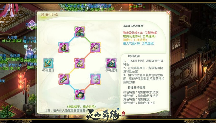 装备共鸣是游戏推出的创新玩法之一,当人物穿戴上有特性的装备时,该装备会自动显示在装备共鸣界面上。在装备共鸣界面中,可以随意移动各个装备的位置。相邻的位置中若颜色特性相同,则能产生共鸣并获得相应的属性效果。