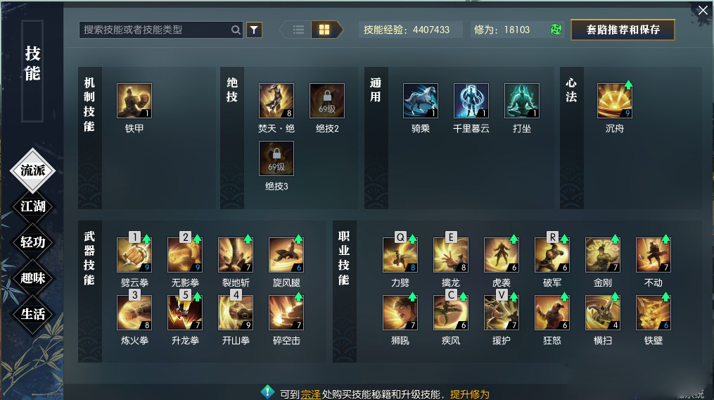最后是关于技能进阶,技能进阶需要流派贡献或者绝技残叶,推荐优先升级金刚,狮吼,一以贯之,狮吼和一以贯之都是用流派贡献升级比较好弄,金刚是用绝技残页升级的,绝技残叶很贵,大部分人都用不起,推荐使用加金刚等级的项链,这种加等级的装备也是可以进阶的。