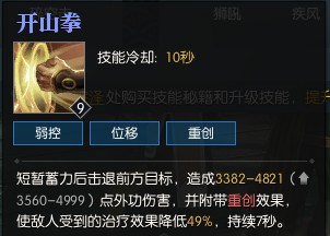 武器技能推荐使用 劈云拳,无影拳,旋风腿,游龙盘打,开山拳这5个技能包括了一个基本的输出与怒气获取搭配:无影拳+旋风腿+冲劲寸拳(以下简称寸拳),