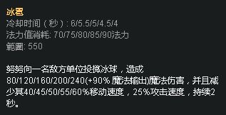 努努主要的输出技能,对单体造成伤害,并且还能减少攻速和移速,让对手非常头疼,尤其是这个技能满级后的冷却只有4秒,当达到满冷却属性时仅为2.4秒,持续时间是2秒,这意味着真空期只有0.4秒。