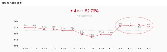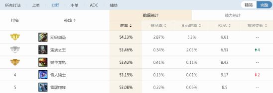 上图为韩服opgg中努努在打野位上的表现,从8.2版本被加强后一直以高胜率的姿态占据着胜率榜前几名的位置,虽然在8.5版本只排在了第四名,从长远出发努努还可以走得更远。