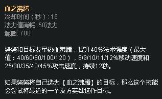 英雄联盟中为数不多增益型buff技能,可为自己和友军提供40%法强加成,还有攻速和移速,效果堪比一个绿叉。这个技能可以为双C的输出带来极大幅度的提升,再足够多的冷却下可以让两个队友身上同时携带增益buff。