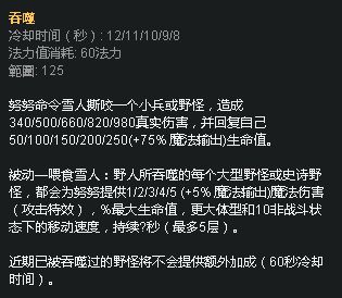 首先是努努的被动技能,每当努努进行5次普攻,下个技能将不消耗法力值,并且使下个技能的威力提升一个等级,也就是说3级大招能发挥出4级大招的威力,下面为被动所强化小技能的最终数值: