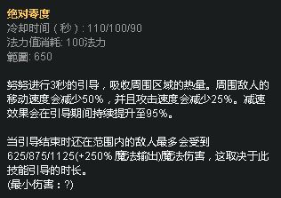 努努的大招与死歌一样,都需要经过3秒的引导,而区别在于被打断后努努仍然可以造成伤害。 引导期间敌人在施法区域内会被持续减速,同时也减少敌人的攻击速度,通常用来分割战场。大招的伤害与引导时间有关,这个技能的基础伤害和加成都非常高,也是草丛原子弹的由来。