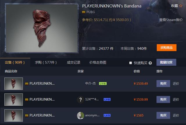 《绝地求生》饰品价格已经连续三天保持10%的涨幅了,在股票市场来说,相当于三天涨停。截止目前,绝版红色面巾的价格已经上涨到1540元左右,今日最高成交价为1600元。