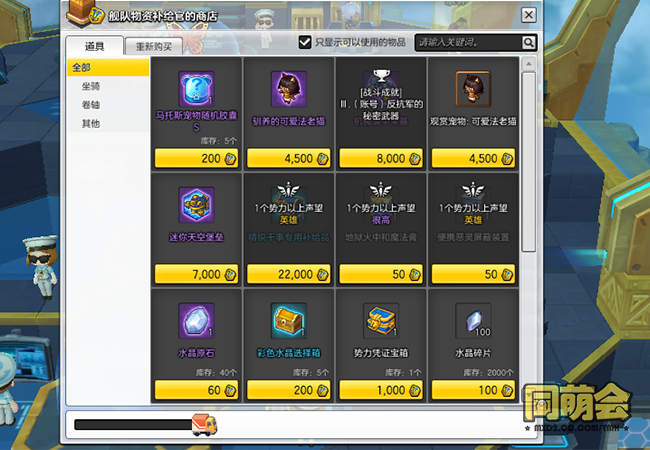 幸运商人和幸运勋章兑换商人处可以购买①双人表情动作:行李,②情侣特效徽章箱:绚烂烟花,③有翼蓝鬃毛虎(飞行坐骑),④白狐皮肤,⑤美容券:一心复仇的剑客发型,⑥美容券:怀念天界的仙女发型,⑦救生圈徽章:小狗,⑧名牌徽章:中国结,⑨墓碑徽章:尼哈儿王朝之棺,发光祝福之石等等。
