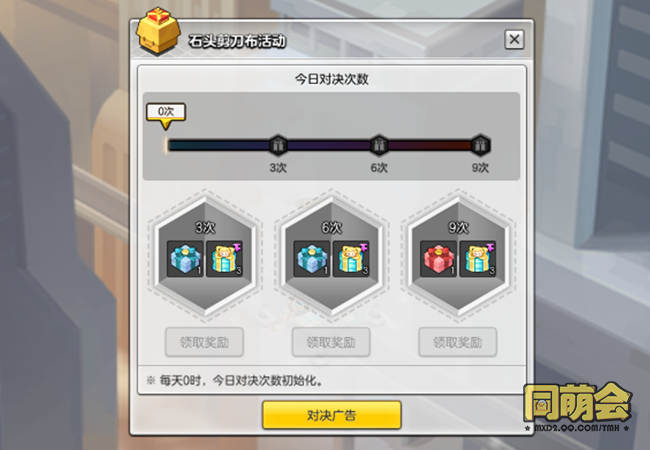 活动期间上线,每天可通过邮件领取15个石头剪刀布对决券;设置广告寻求pk对决:游戏右下角菜单栏,冒险-石头剪刀布-石头剪刀布对决广告,创建广告。猜拳而且还有好礼拿哦!