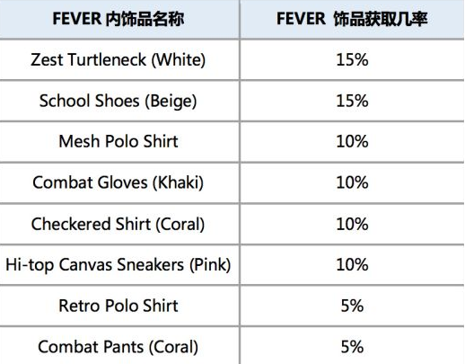 新收费箱子FEVER内饰品获取概率: