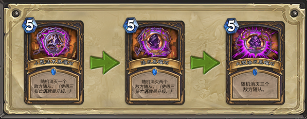 5费 消灭一个随机的敌方随从(使用三个亡语卡后升级)