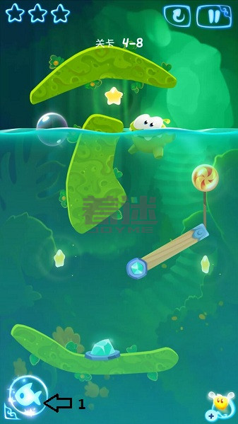 更改主角形态,触到机关后立刻恢复形态,当糖果吃到最左侧星星后割断糖果绳子,它会进入泡泡中,吃到最后一颗星星后戳破泡泡即可。