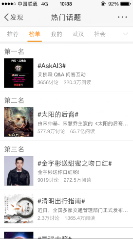 3、这样,我们就可以轻松看到哪些热门话题是网友们讨论最多阅读最多的了。