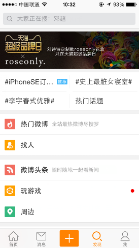 1、登录微博客户端,在发现菜单里点击最上方的搜索,如图: