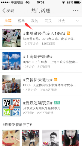2、这个时候,就会出现热门话题,不过这个话题是系统推荐的,如果你想看哪个话题是用户们讨论最多的,就点击榜单,如图: