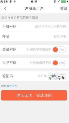 3、在新用户注册的界面,填写完相关的个人信息,注意:登录密码和交易密码不是一样的哦,记得设置不同,并牢记。